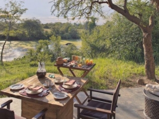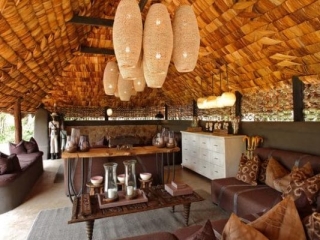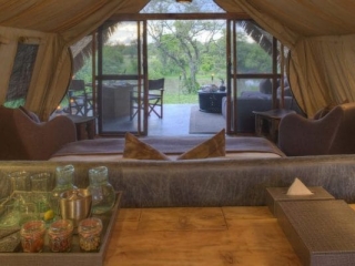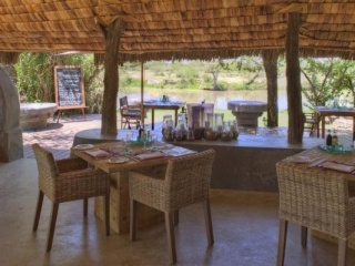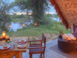 The camp also provides private guest areas and river facing decks where you can enjoy a fine meal or recline with a sundowner drink while looking at game and the wonderful beaded artefacts.  Traditional fires light up the night sky outside, and food is cooked in outdoor ovens while wonderful aromas permeate the air.  Meals are served on the spacious patios that overlook the water, and more special or intimate dinners can be taken at the swimming pool. At night, the camp is lit with flaming lamps or torches, and the magical atmosphere is further enhanced by the night sounds of the African bush.