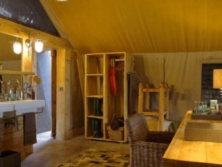 andBeyond Grumeti has a family tent that can accommodate up to two adults and three children. The suite consists of two luxury tents that are connected by an enclosed walkway made of wood and canvas.