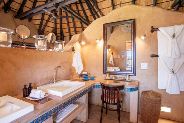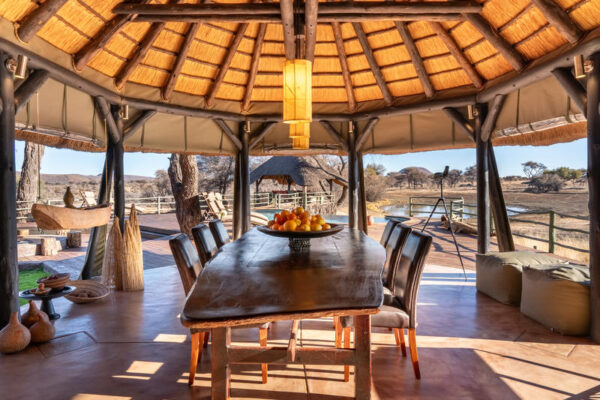 Set on the edge of a natural waterhole with sweeping views over the bush, the villa is booked on an exclusive-use basis and comes with its own private chef, guide, and 4×4 vehicle, allowing you to tailor game drives, tracking activities, and mealtimes entirely to your schedule. The spacious design includes two en-suite master bedrooms in the main house and two separate en-suite luxury rooms, generous indoor and outdoor lounges, a dining area, a bar, a rim‑flow swimming pool, and extensive decks perfect for armchair game viewing. Décor is warm and contemporary with natural stone, wood, and rich textiles, creating a sophisticated yet relaxed atmosphere. Guests enjoy fully inclusive hospitality with all meals, most drinks, and a wide range of activities such as leopard and hyena tracking, guided walks, and visits to AfriCat’s conservation projects. With its seclusion, dedicated staff, and exceptional wildlife encounters, Okonjima Villa is one of Namibia’s most sought‑after private safari retreats.